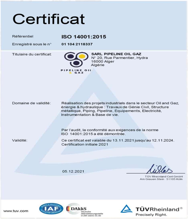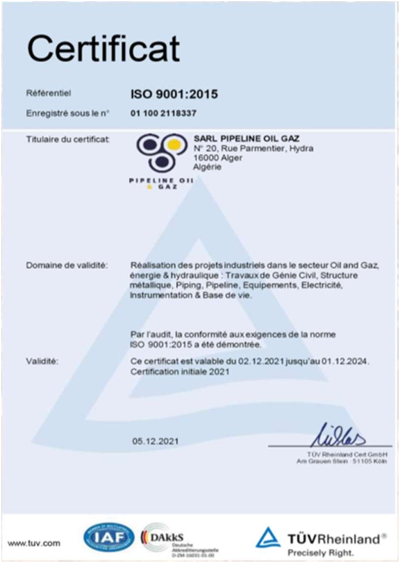 a year ago, and according to its development, SARL PIPELINE OILGAZ felt the need to improve its management, for this purpose, it iscommitted to the implementation of an SMI management systemaccording to ISO standards 9001: 2015 - 14001: 2015 and 45001:2018. Last month this certification was obtained.
